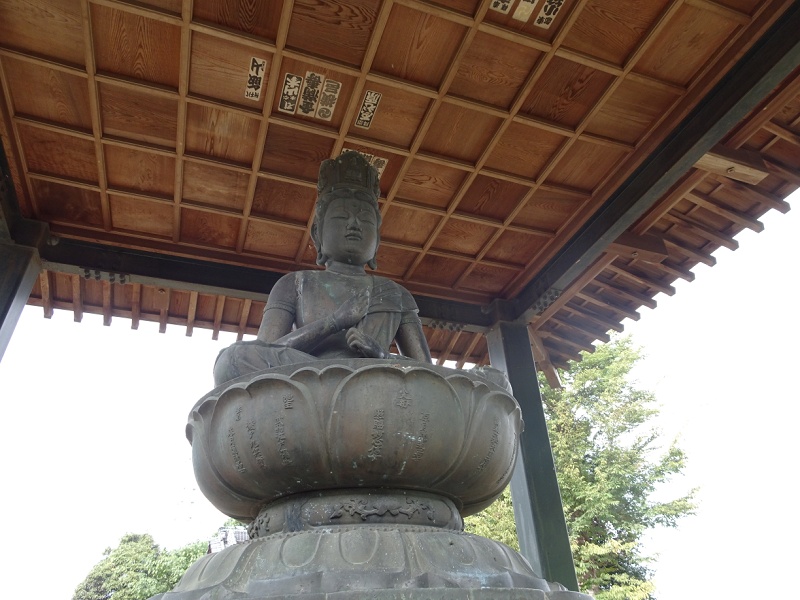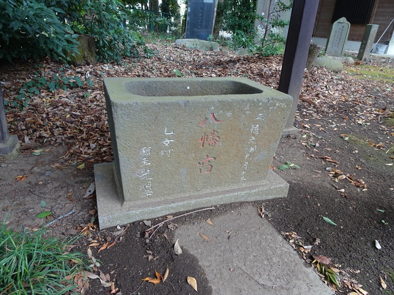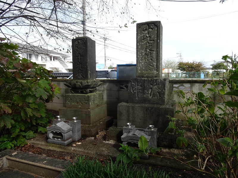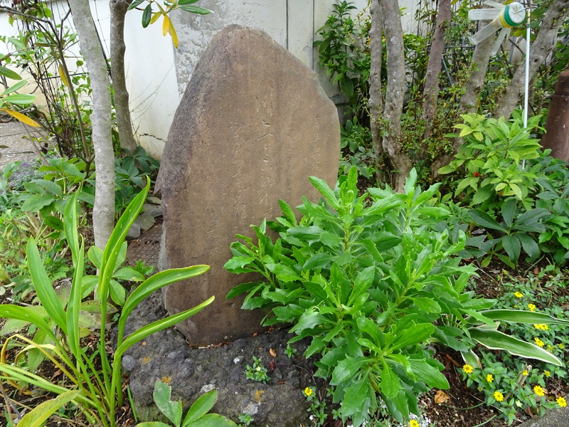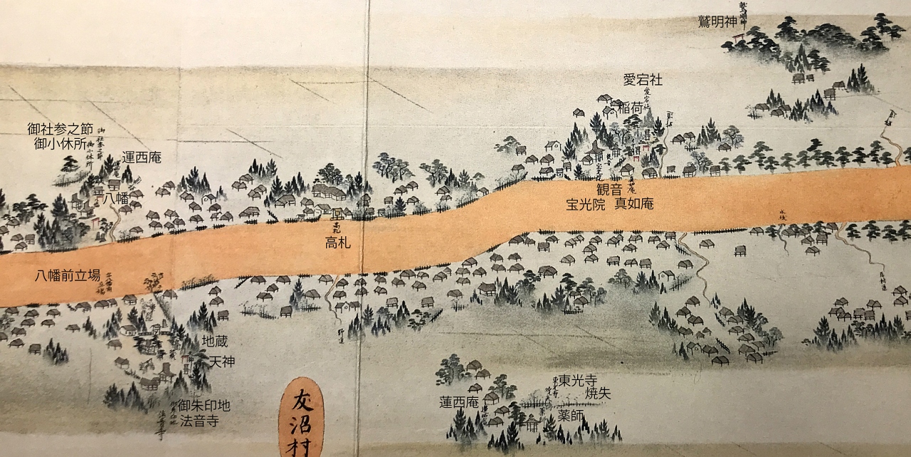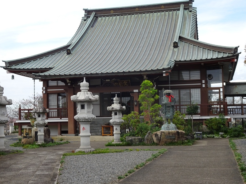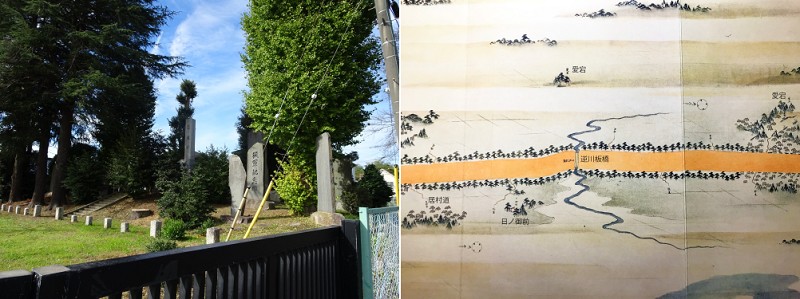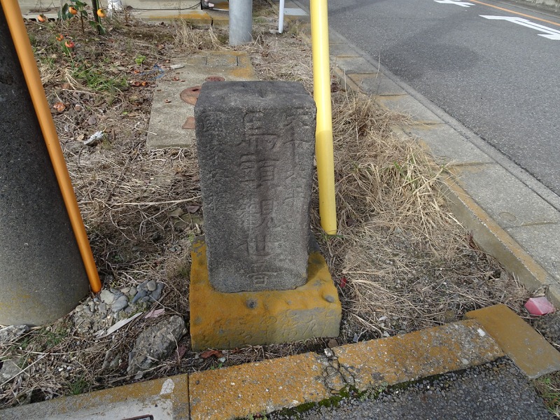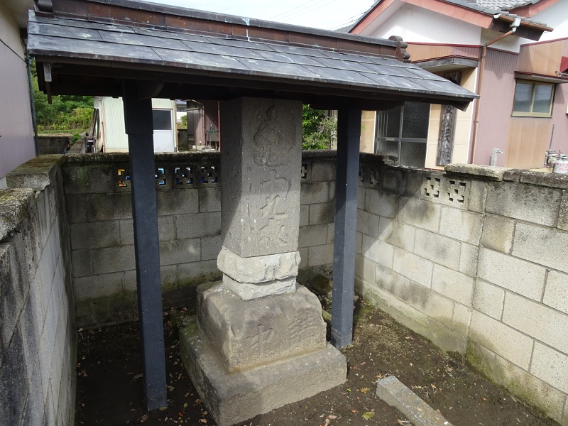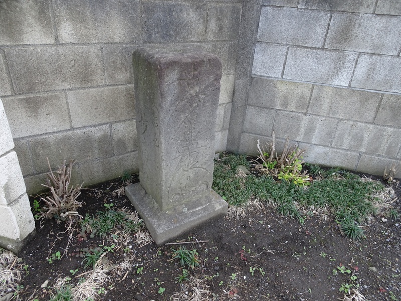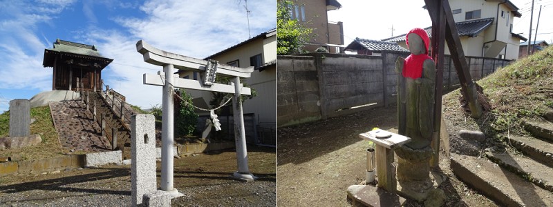 この付近にあったとされるのが「逆川城」です。中世から戦国期の城館跡とされます。城館跡と思われるところから出土した石や忠魂碑の付近に散在していたという板碑が残されていますが、現在ではそれらしき箇所は確認できず、規模は不明だそうです。フェンスで閉じられており、中へ入ることができないため、どのような石碑があるのかわかりません。 日光道中分間延絵図を見ると、このあたりに「日ノ御前社」が描かれています。この場所ではなかったのかな、と思いますが、詳細はわかりません。 日光街道へ戻り、車の通行量の多い国道を450mほど進みます。右手の民家脇に題目碑があり、この路地を入っていくと小さな稲荷の社があり、小高い丘に「愛宕神社」があります。愛宕神社の裏手に廻ると大きな地蔵があり、墓地が「真如庵跡」と思われます。道を挟んだ向かいの町内会館がある場所が「宝光院跡」で、観音堂が残されています。