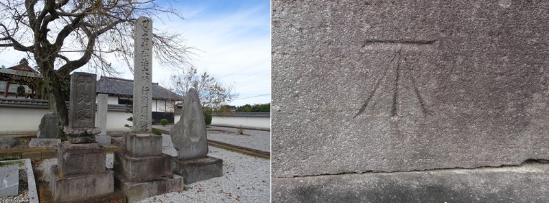 「高祖弘法大師行願圓満塔」と彫られた台座の下のほうに几号が彫られています。明治初期に日本でイギリス式の水準測量に用いられた「不」の字に似た標識です。東京から宮城県塩竈までの日光街道沿いには多く残されています。