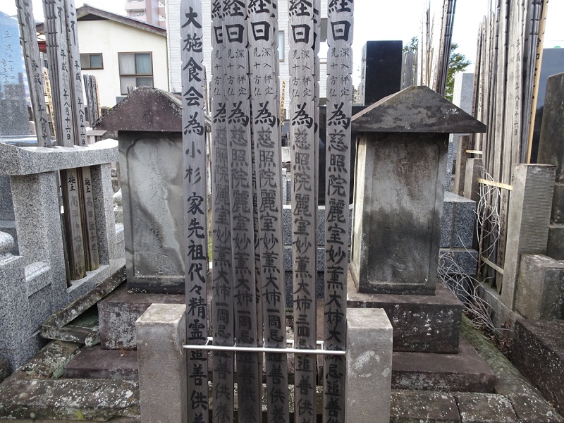 元卿は1767年(明和4)49歳で没し、双桂は「古河教授」の肩書で墓碑銘を撰文しました。古河に来てからの小杉家の墓としては最初のもので、唐津風の形態をしています。並んで建つ「月窓孺人藤掛氏之墓」は藤懸(藤掛)家から入った元卿の妻のものです。